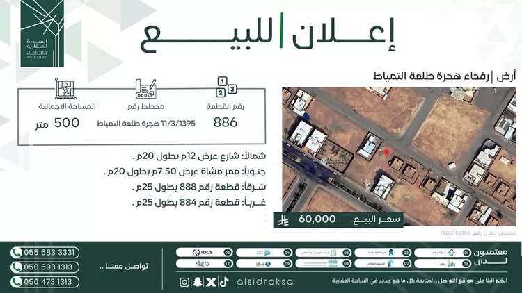 🛑 ارض سكنية للبيع ▪️رفحاء - طلعة التمياط في الحدود الشمالية ▪️المساحة " 740 متر مربع" ▪️رقم القطعة 673 ▪️شارع عرض 20*20 متر بواجهة شمالية غربية 🔸سعر البيع | ثمانية وخمسون الف ريال ( 58,000 ) ____ مكتب السدرة العقارية للتواصل والاستفسار 📞 055 583 3331 📞 050 473 1313 📞 050 593 1313 تابعونا على حساباتنا في مواقع التواصل الاجتماعي: 📱 Instagram | Twitter | Snapchat @alsidraksa للاطلاع على المزيد من العروض العقارية، يسعدنا تواصلكم معنا.