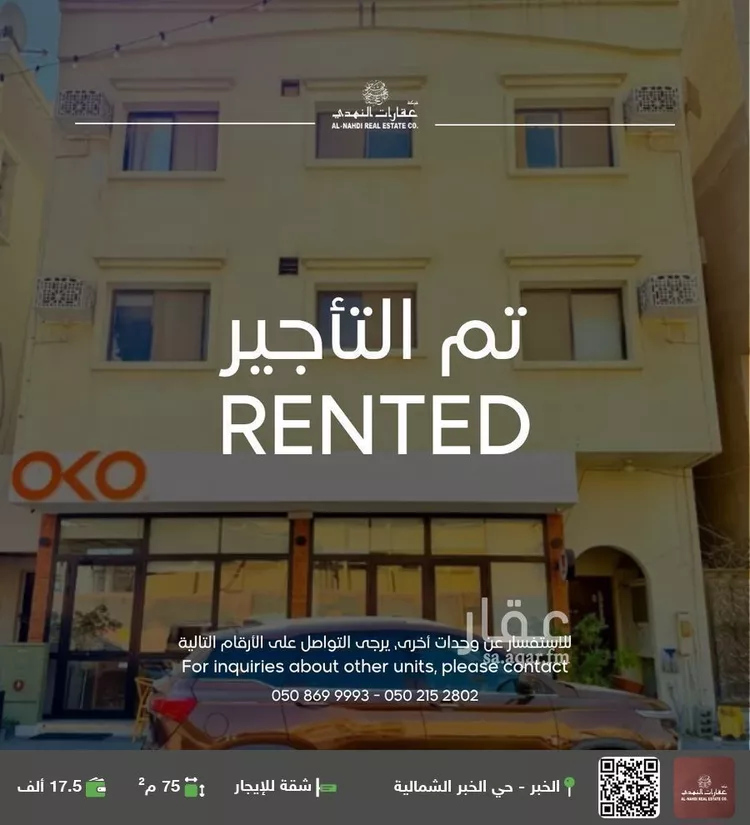 قناص الخبر العقارية . لادارة الأملاك وبيع وتسويق الأراضي والوحدات العقارية . 🔵شقة للايجار - مبنى رقم 126 - للعوائل فقط . 🔵 مواصفات الشقة : مواقف خاصه / مصعد / غرفتين نوم ماستر / صاله كبيرة / مطبخ منفصل / غرفة غسيل / مكيفة اسبلت بالكامل ومصينة بالكامل . 📱للمعاينة والاستفسار : 0506764778 - 0508710577 - 0509539920 الادارة : 0531146556 يوميا عدا الجمعه من ٨ صباح الى ١٢ ظهرا من ٤ الى ٨ مساء .