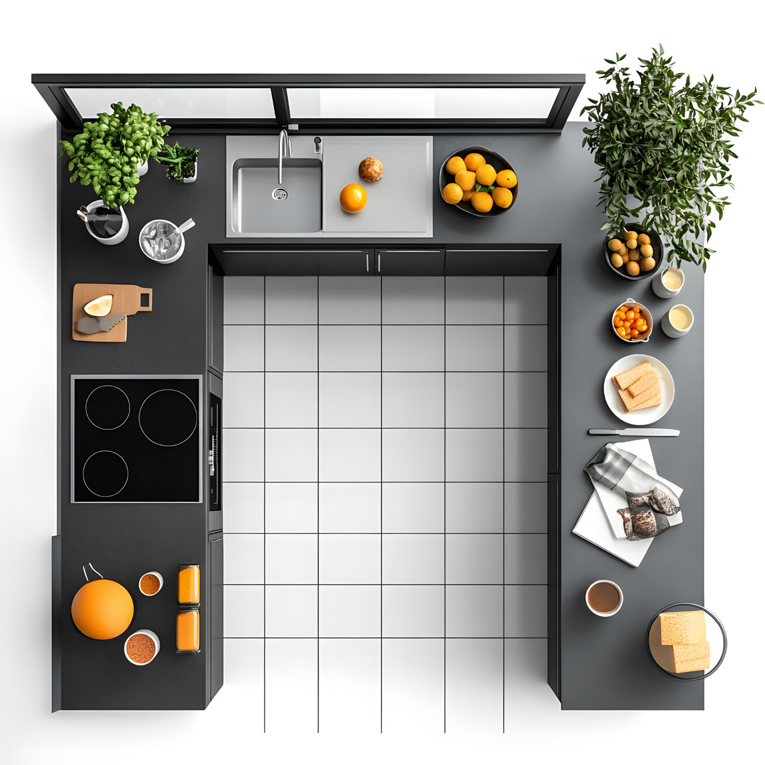 - إمكانية توزيع الحوض والموقد والثلاجة على أضلاع المخطط بما يتوافق مع معايير مخططات المطابخ التي تعتمد على وضوح مسار الحركة.